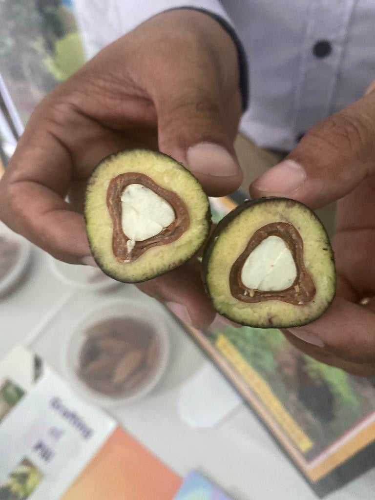 Due to its very high fat content, the Pili nut has a buttery, olive-like roasted pumpkin seed flavor. The pulp is both creamy and slightly fibrous. In the Philippines, this nut is usually roasted and sweetened as a snack or incorporated into various culinary preparations.